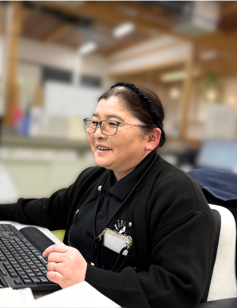 現在は、電話対応や書類管理などの一般事務をはじめ、パソコンのメンテナンスやシステム管理など幅広い業務を担当。特に、エコアクションの更新作業や浄化槽関連のシステム管理など、専門性の高い業務にも携わっています。細かな書類作成や審査対応など、正確さと効率を求められる仕事に日々取り組んでいます。